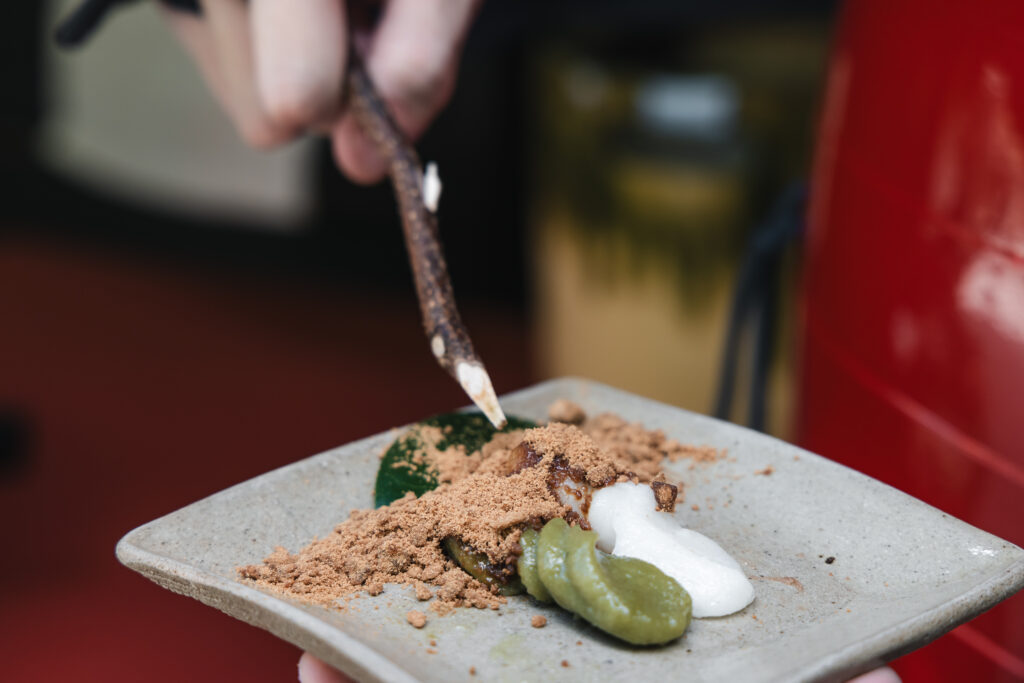 品嚐香氣四溢的黃豆粉團子與抹茶,甜品沁入疲憊的身心,真是舒暢啊~。