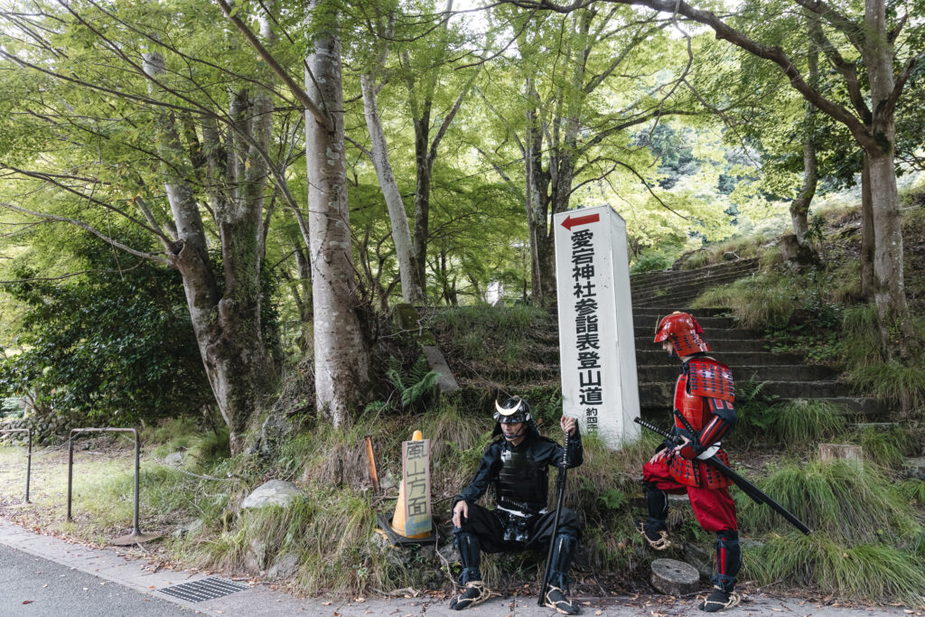 但說到此處……侍從們投降了。雖然天氣已轉涼,但穿著甲冑在33度的高溫下登山仍然過於危險,因此當天決定中途放棄。距離山頂約還有40分鐘,但我們不得不折返,遺憾地無法參拜愛宕神社。