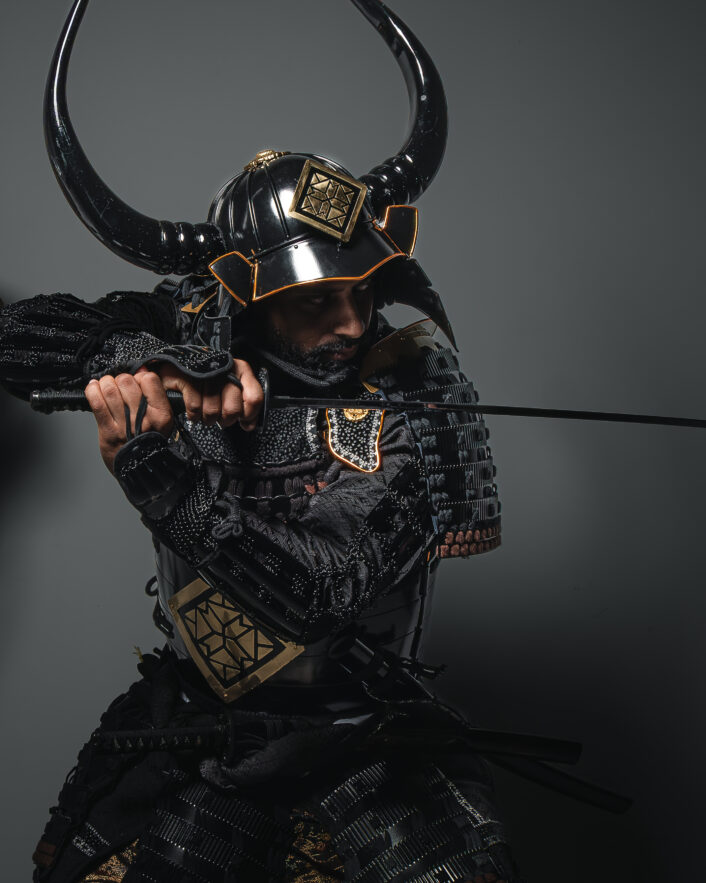 Holding the sword aloft in a powerful stance, calm yet unyielding, the presence alone speaks of discipline, focus, and unwavering resolve.