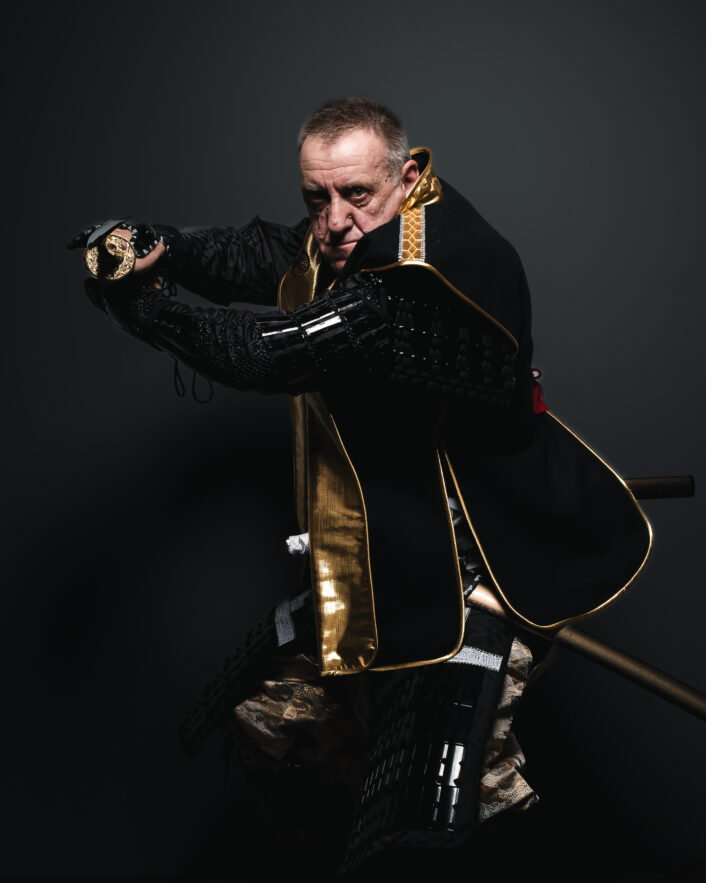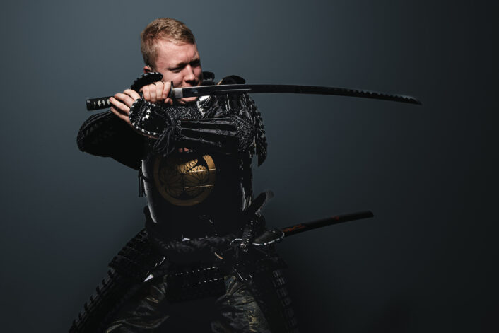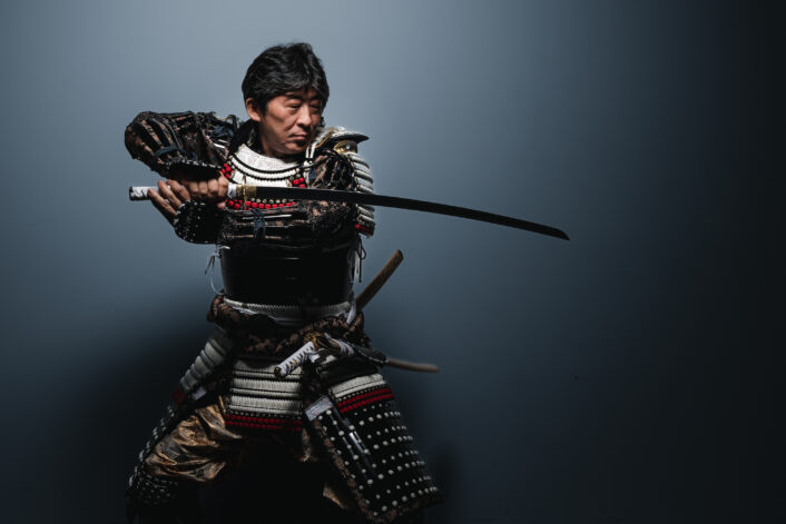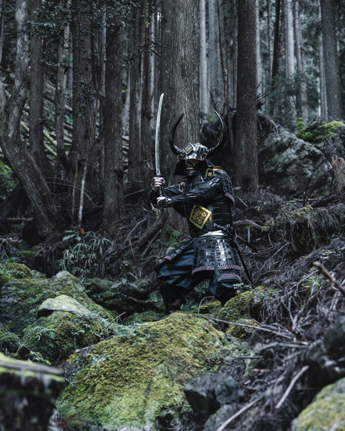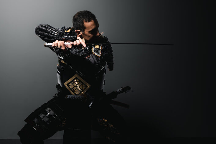 A genuine samurai stance, held with such precision and tension that it feels as though the next moment could erupt into motion.