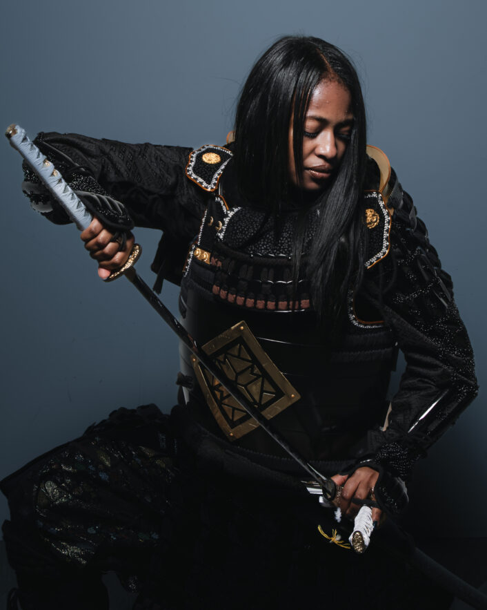 Holding the sword aloft in a powerful stance, calm yet unyielding, the presence alone speaks of discipline, focus, and unwavering resolve.